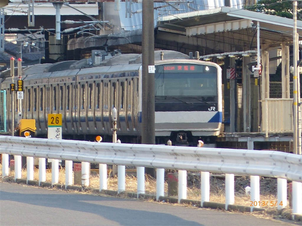 8両編成です。かんとーちほー? だから、あたりまえのあさめしなのです。(※なぜか疑問形)…じゃなくて、電車を「その大きさ」と思って見たときに、周りの物は結構、大きいよ、フェンスの高さはそのくらいあるよ、センターラインのない道路だけど幅はこんなだよ、だけど軽自動車はこんなに小さい、そういう『スケール感』という主観的なものをですね(以下略)しつれいしました。樹木の葉の色は(そういう季節には)若々しく黄緑色になってほしい。ブランド街…いえ、その奥の小山公園(ぐぇ)バックネットと照明設備のある運動施設。(※体言止め)赤と白に塗られた鉄塔。(※体言止め)まさにA9V6(でほしいもの)ですな。