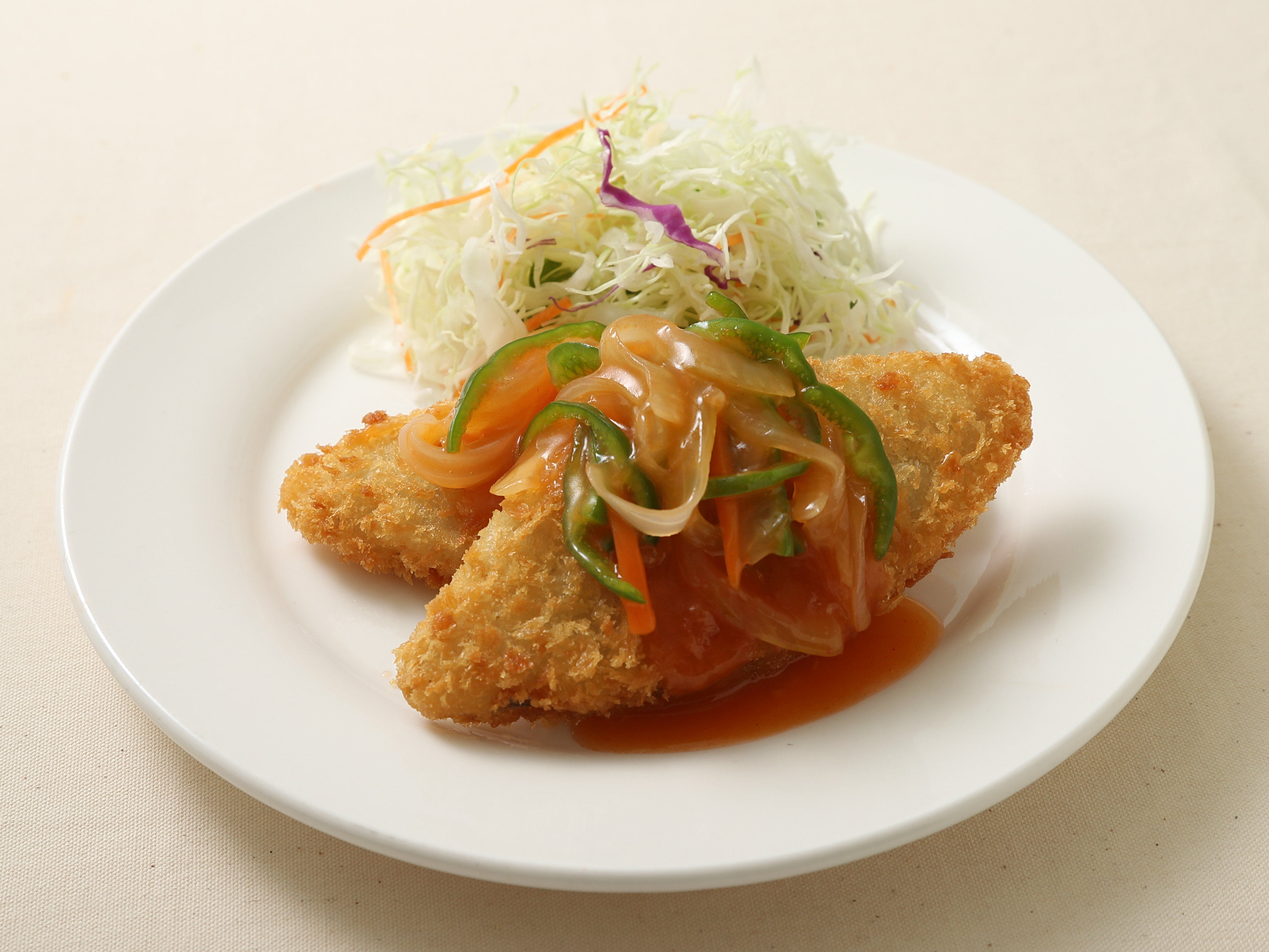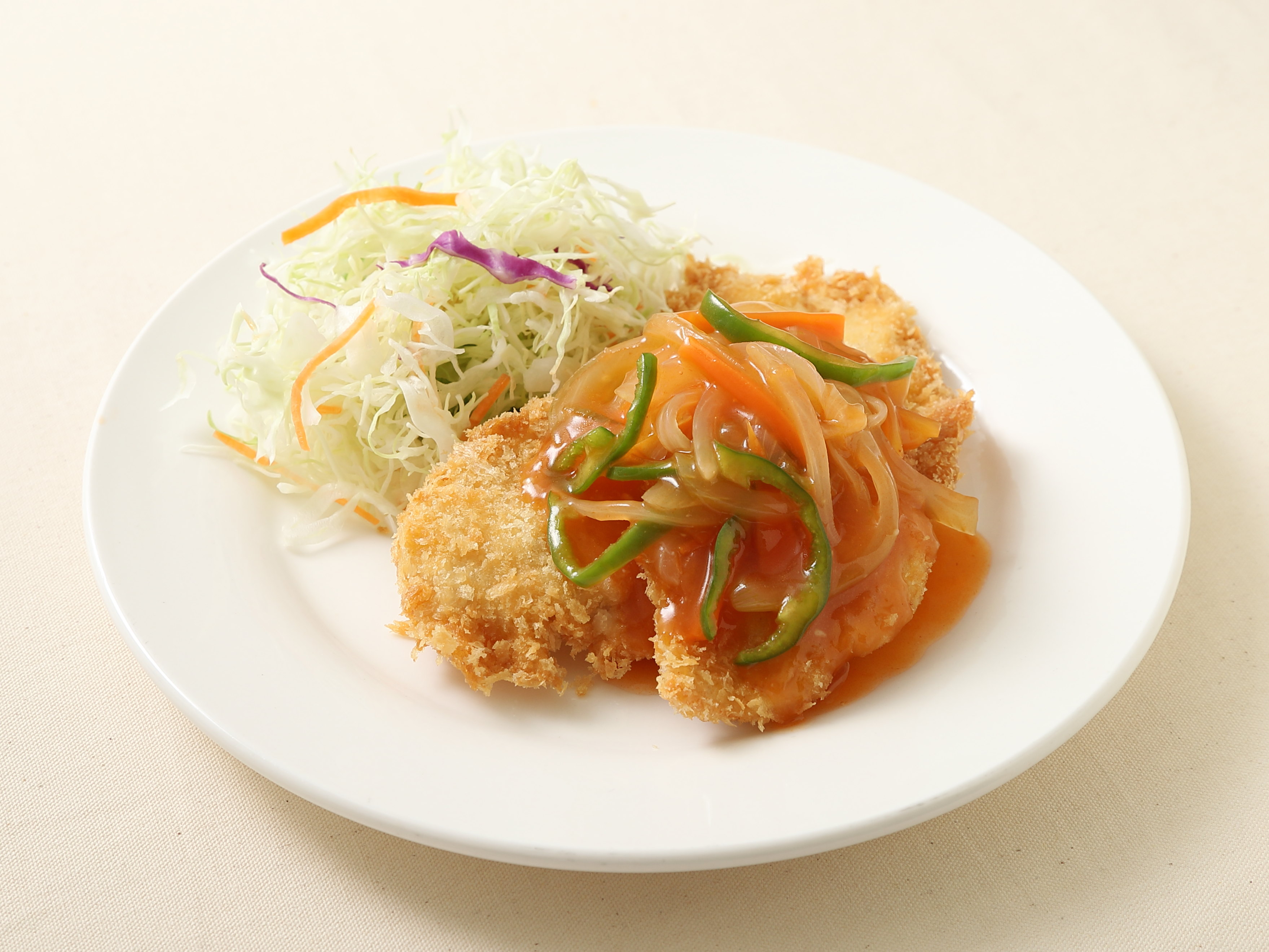 「ジュレ」という名称が知られていないうちの一般の人の理解としては、これ(※白身魚フライの甘酢あんかけの類)のバリエーションだと、魚の代わりに鶏肉だと、そういう理解だったように思う。弁当や惣菜だから、あんを硬めにしてこぼれにくくしてあるんだと。(※個人の感想です。)
